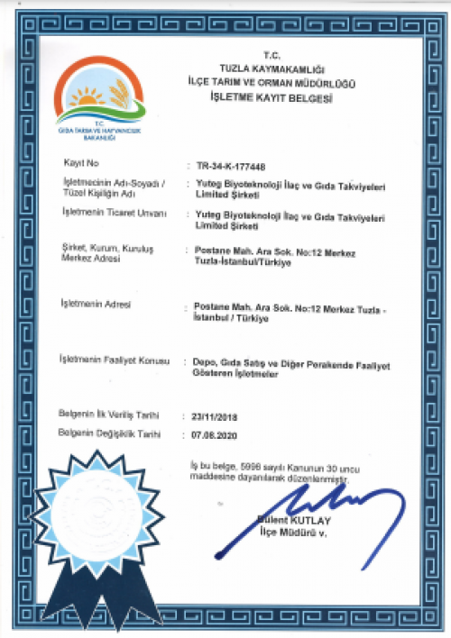 İşletme Kayıt Belgesi: 23.11.2018 ve 07.08.2020